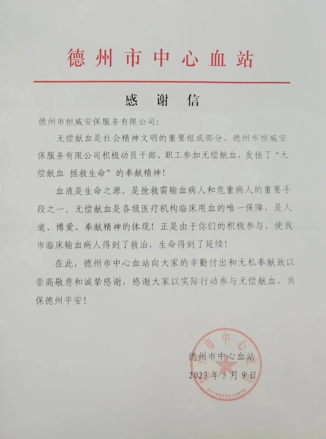 5月9日,德州市恒威安保服務(wù)有限公司組織開展“獻(xiàn)出一份血,傳遞一份愛”無(wú)償獻(xiàn)血活動(dòng),以實(shí)際行動(dòng)支持無(wú)償獻(xiàn)血活動(dòng)。