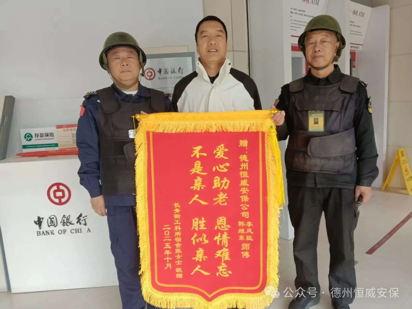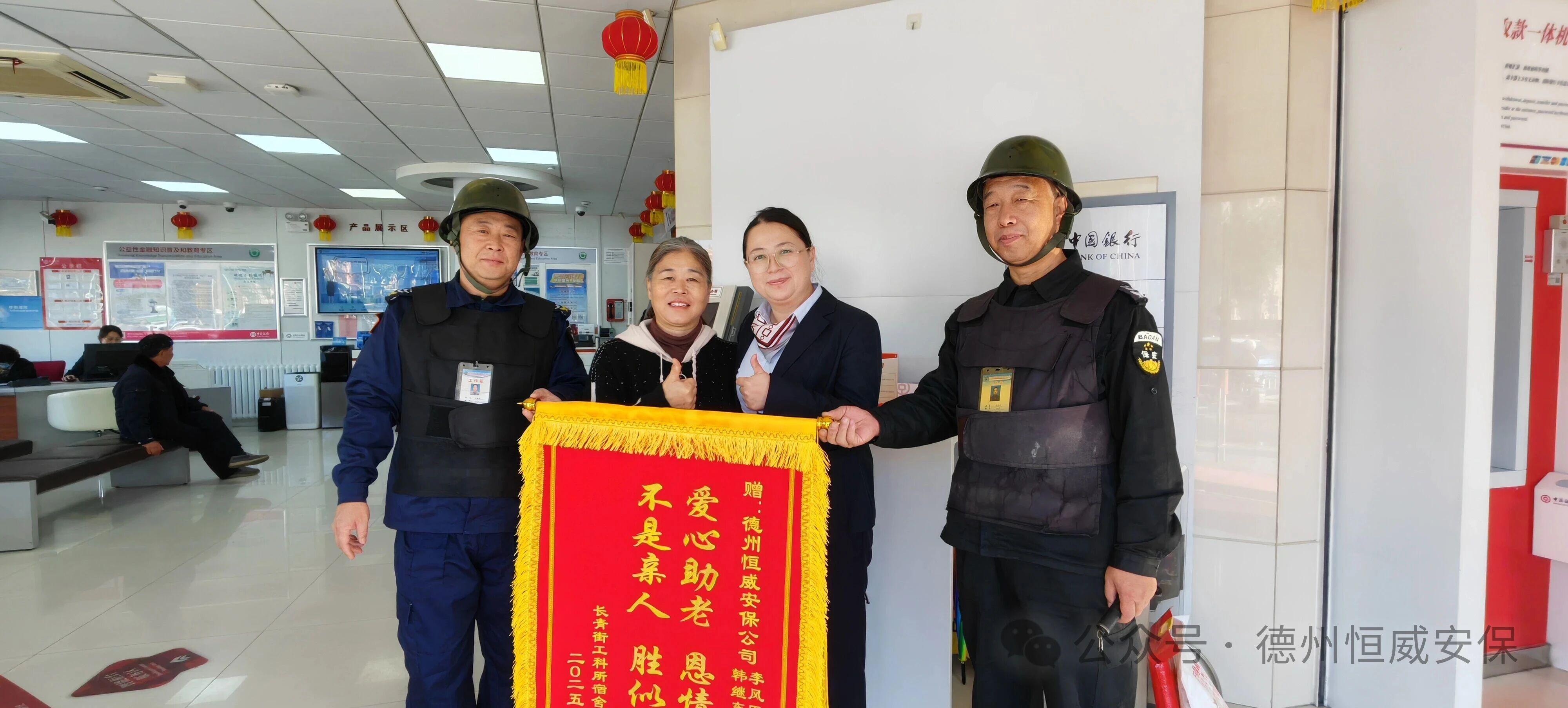 近日,家住長(zhǎng)青街工科所宿舍的張女士專程來(lái)到中國(guó)銀行新湖支行網(wǎng)點(diǎn),將一面印有“愛(ài)心助老,恩情難忘,不是親人,勝似親人”的錦旗交到駐點(diǎn)保安員李風(fēng)臣和韓繼東手中,以此感謝他們對(duì)家中八旬母親的及時(shí)救助與溫情守護(hù)。