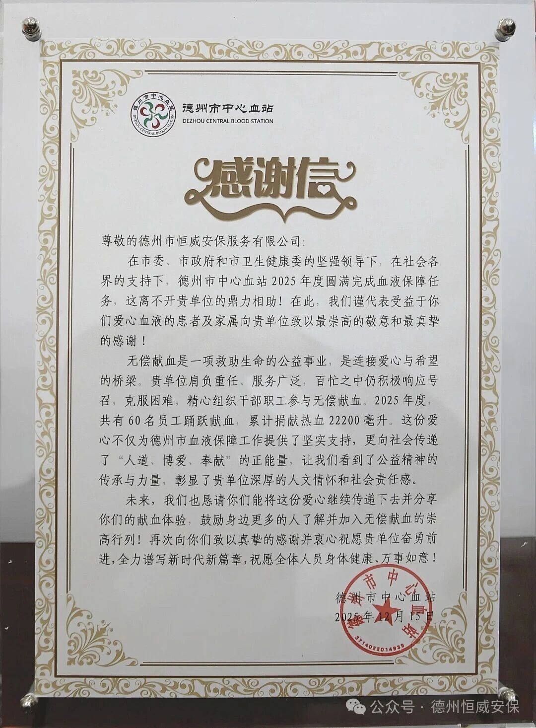 【工作動態(tài)】熱血見證擔(dān)當(dāng) 榮譽激勵前行 ——德州市中心血站領(lǐng)導(dǎo)親臨恒威安保贈送感謝信